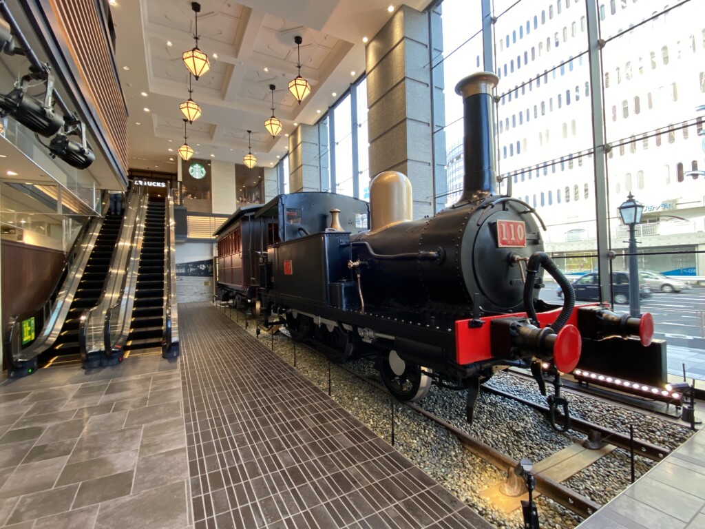 鉄道創業の地にて余生を過ごす110形は、ビルに入るとほぼすぐのところに、線路に乗せられた状態で置かれています。