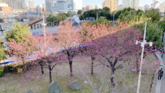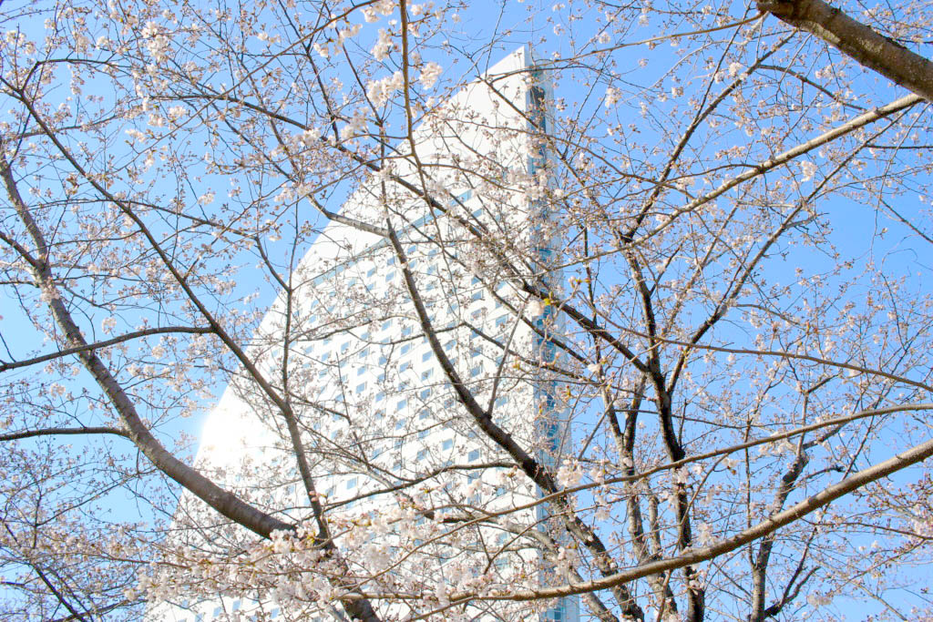 海に面していて、周辺にはインターコンチネンタルホテルやコスモワールドの大観覧車もあるということで、みなとみらいエリアの人気お花見スポットとなっています。
