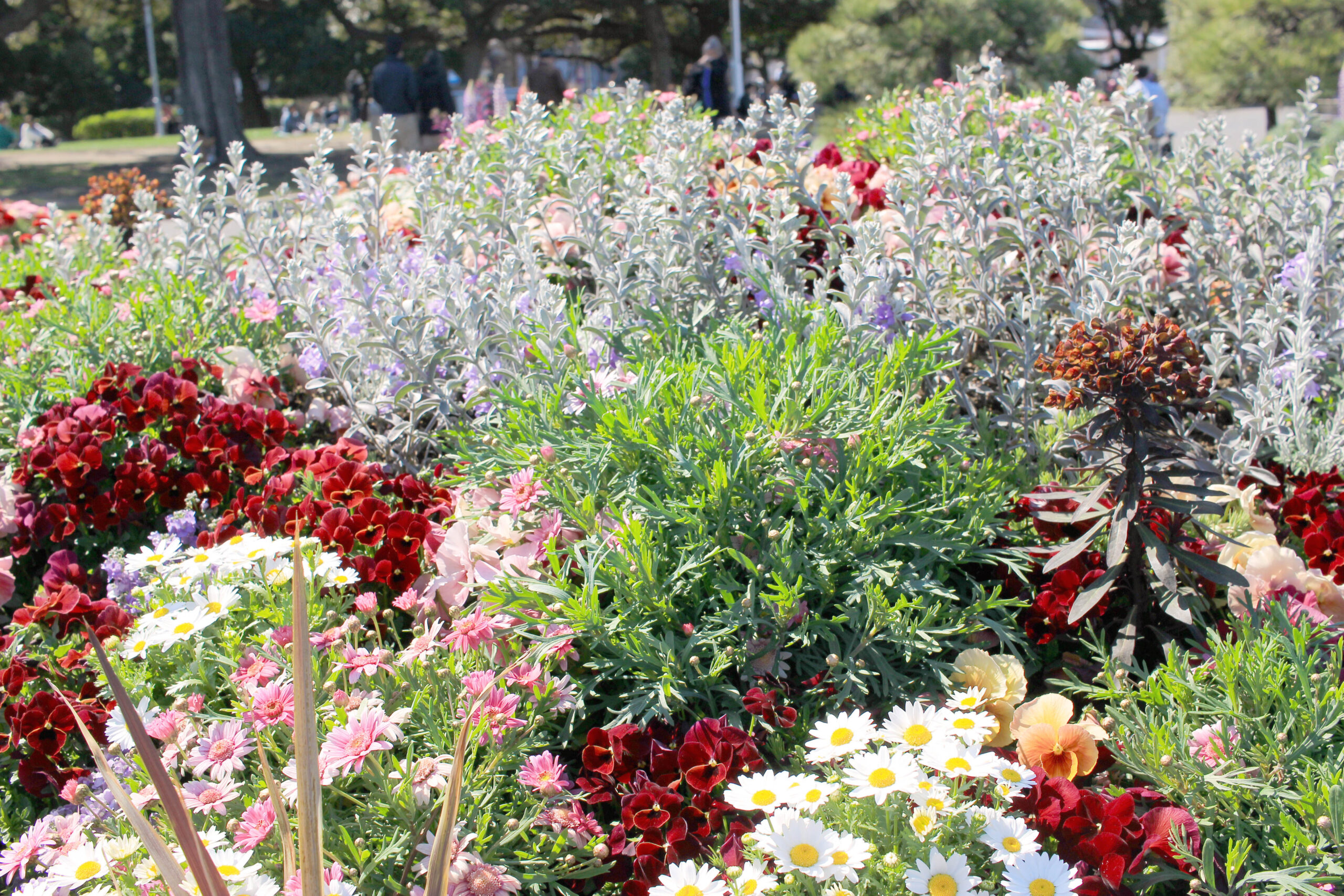 中華街東門(朝陽門 ※)からまっすぐ山下公園を目指した時の公園入り口(中央口)付近に、一目でイベント開催中であることがわかる花壇やボードが置かれていますが、