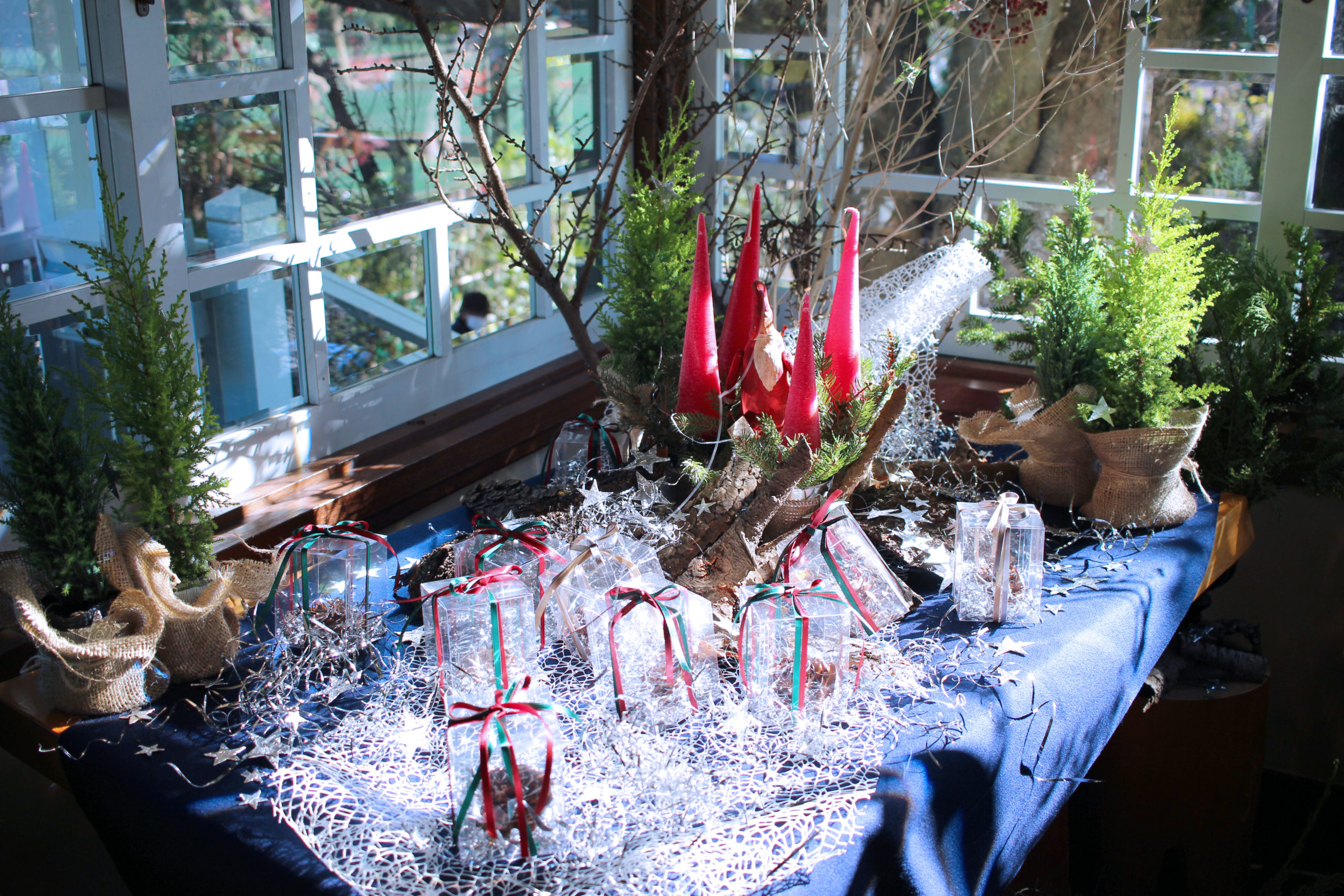 館内に入ってすぐのところに飾られたツリー。窓の外は山手公園の芝生エリア方向です。