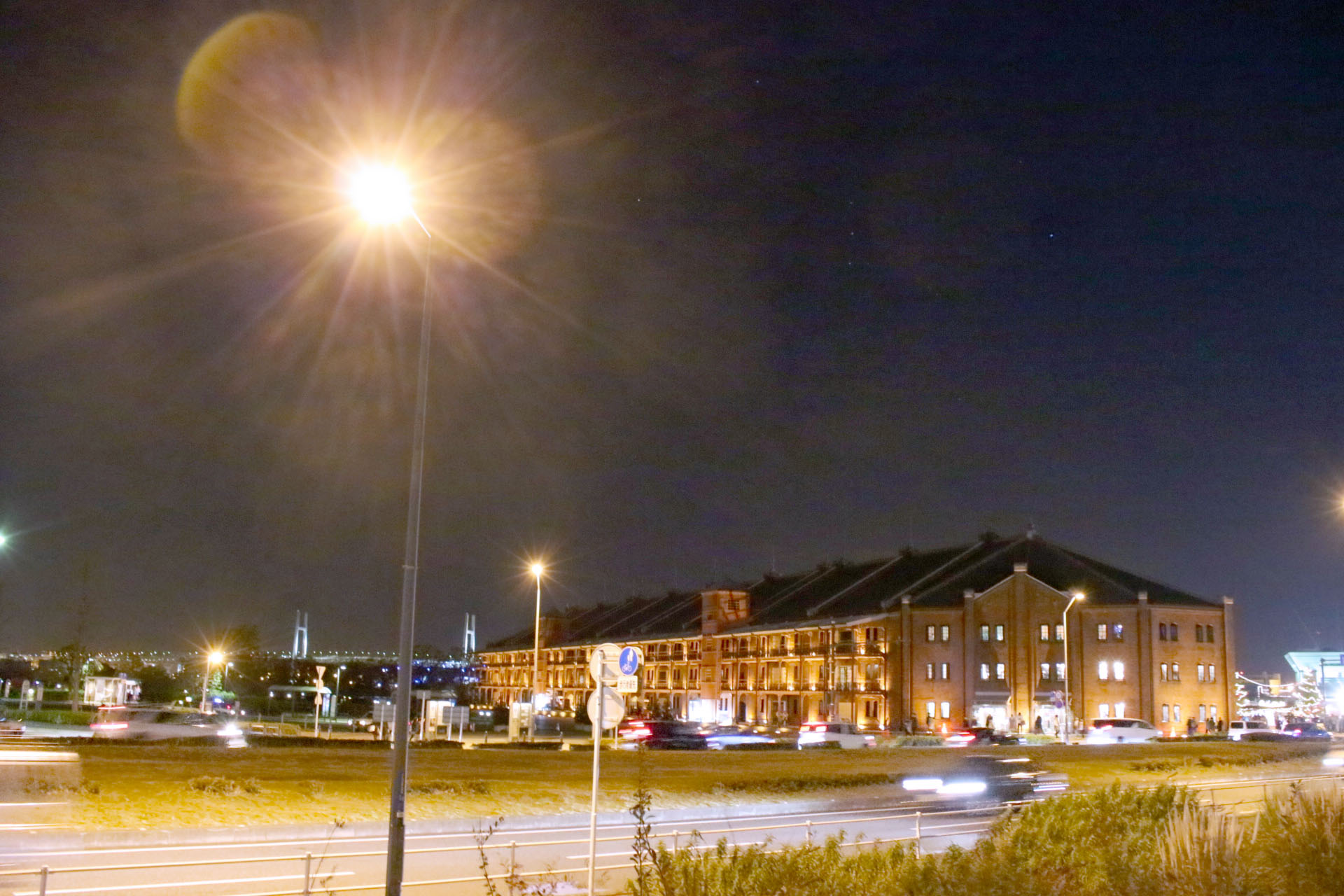 正面に夜の赤レンガ倉庫と、その左横にライトアップされた横浜ベイブリッジです。