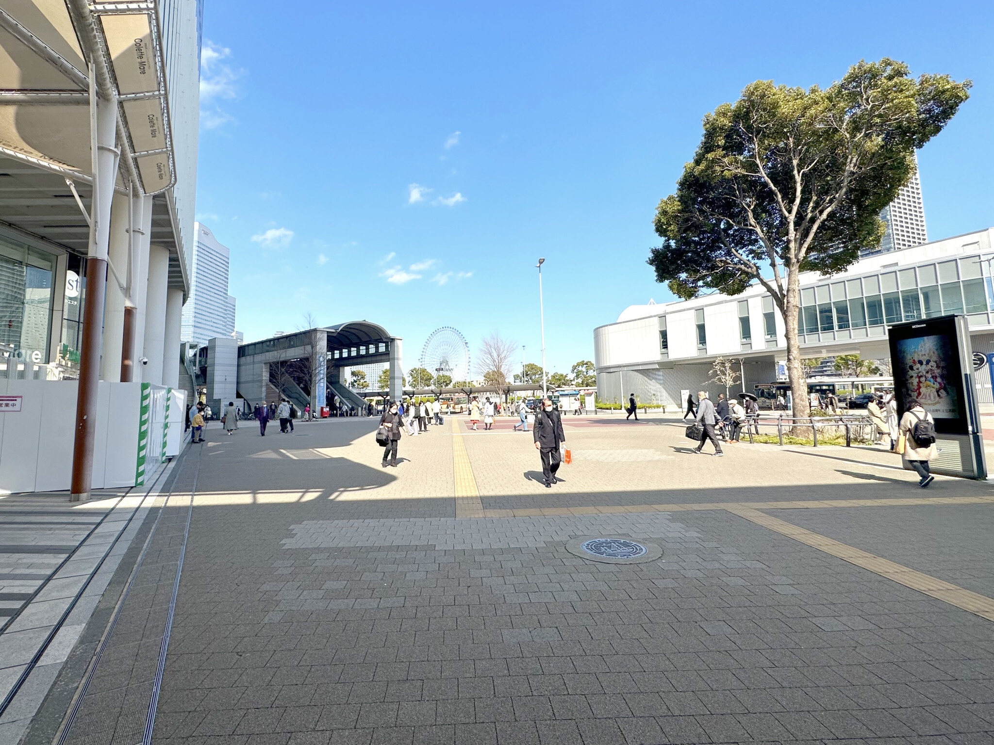 北改札付近からの風景では、コレットマーレ横から動く歩道入口やコスモワールドの大観覧車・コスモクロック21も視界に入りますが、