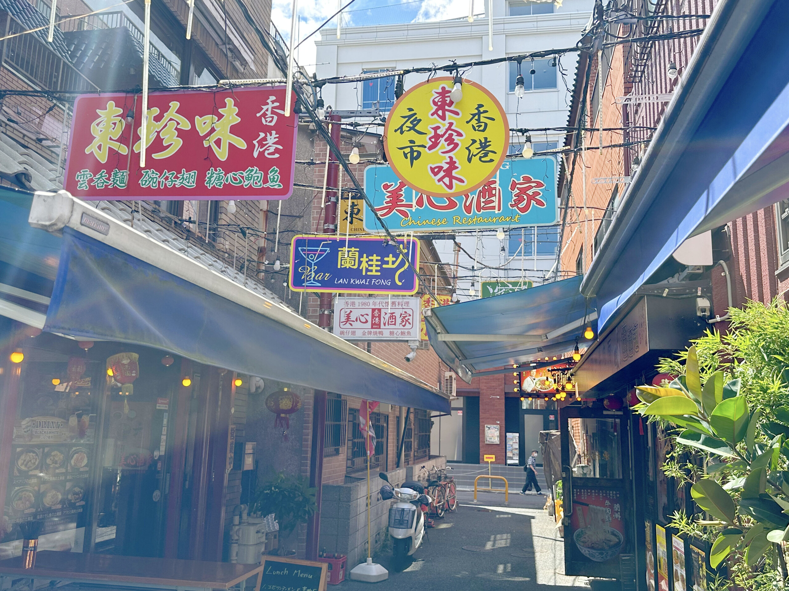 その横濱華僑総会のビルの前には、醸す雰囲気がまんま”台湾の食べ歩きスポット”といった感じの看板が多く掲げられた、細い道が作られています。