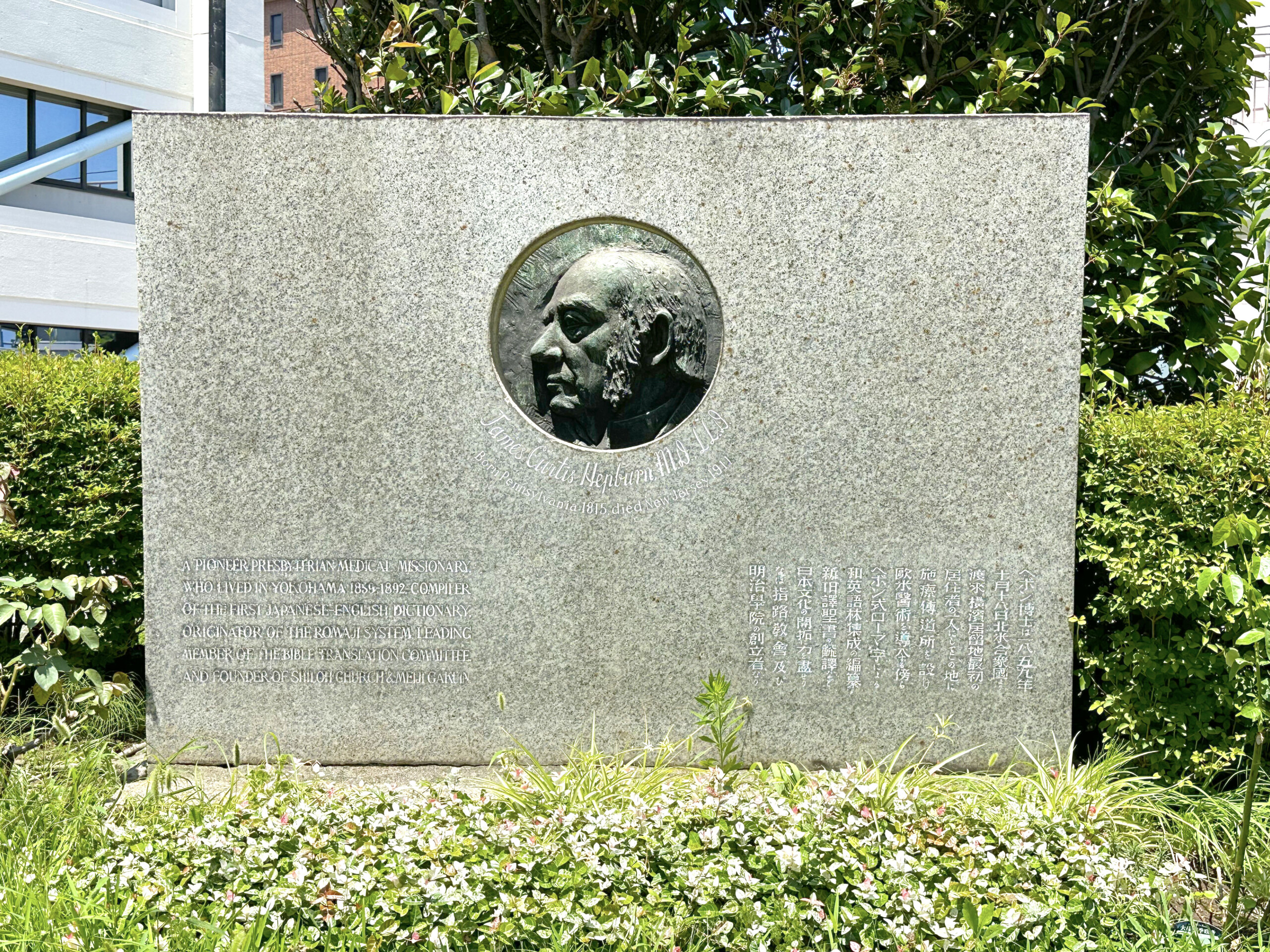 どこかトリックアートのような作りになっていて、ヘボン博士の顔が浮かんで見える石碑と、