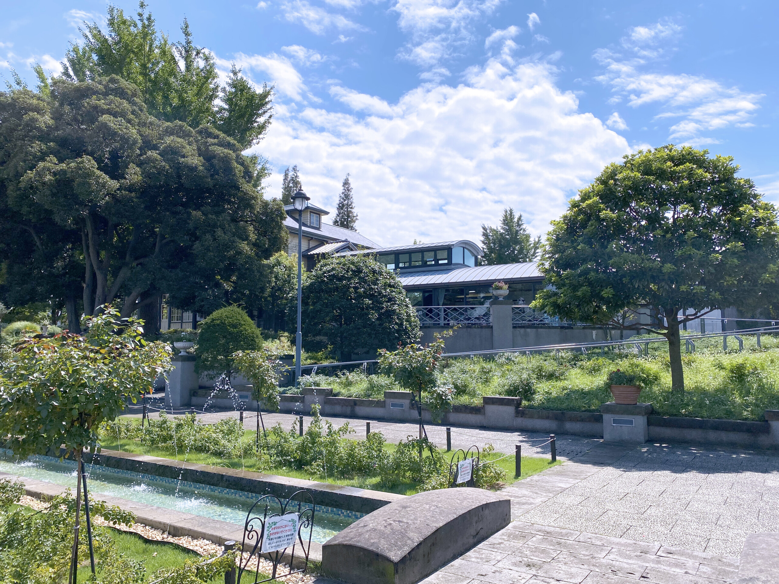 “イタリア式”庭園の個性である庭園内の噴水と外交官の家・ブラフガーデンカフェが、これから紅葉へと向かう緑の中で”夏の終わりと秋のはじまり”に包まれています。
