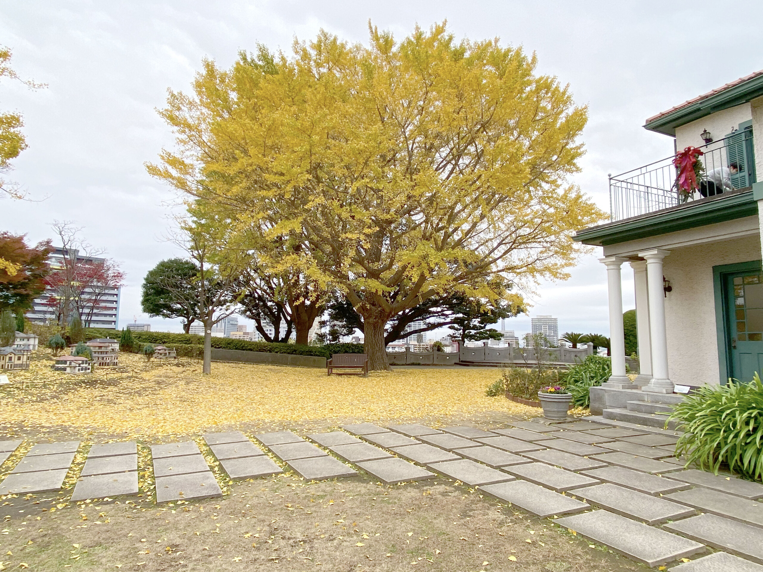 遥か遠くには横浜港にかかるベイブリッジを望むことができるというイチョウの木前の人気スポットも、今は秋真っ盛りです。