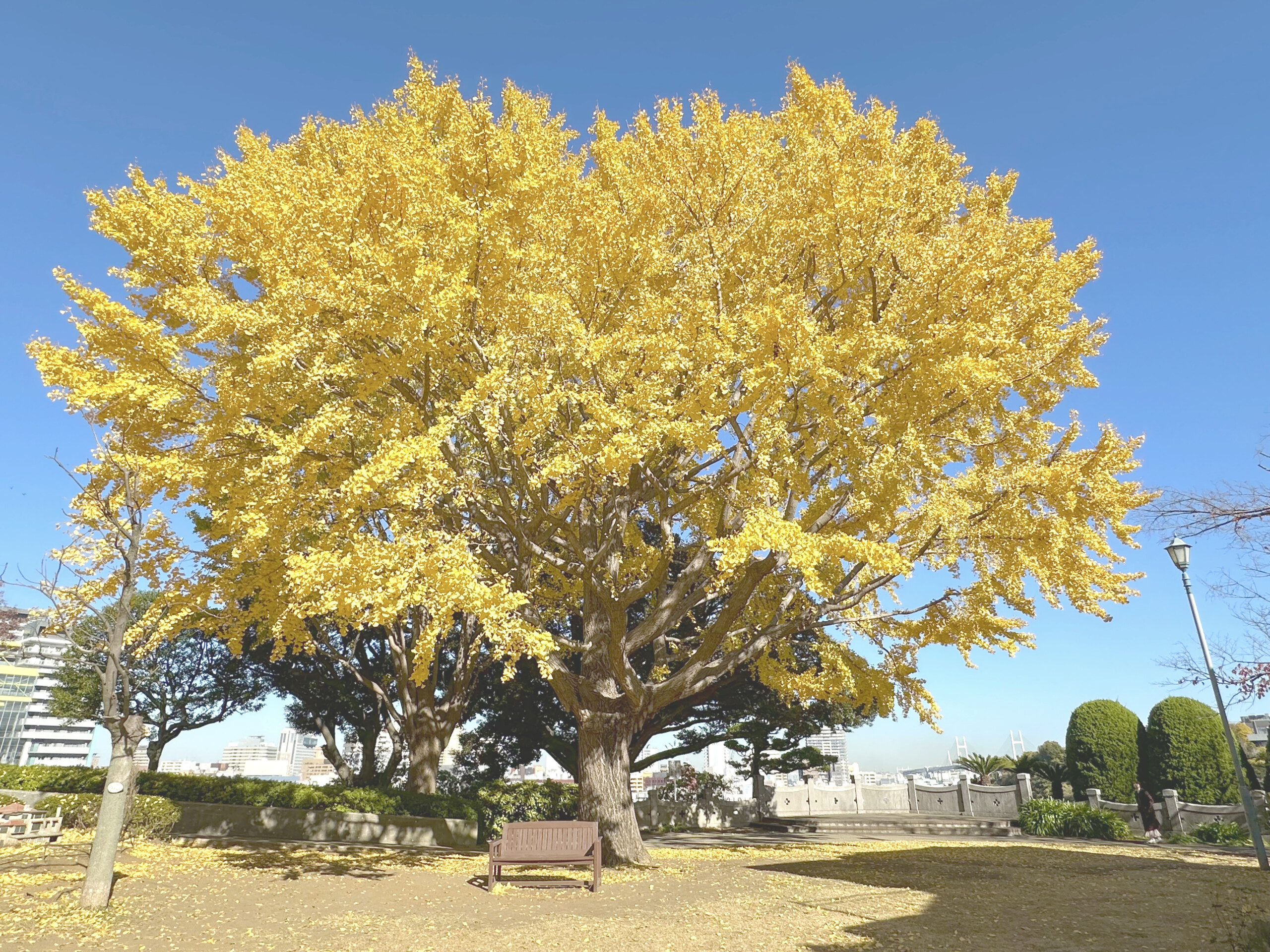 その昔の横浜では珍しい風景ではなかったのかもしれませんが、今となっては”ブラフ18番館横”名物である大きな銀杏の木と、その前にはおあつらえ向きのベンチも用意されています。