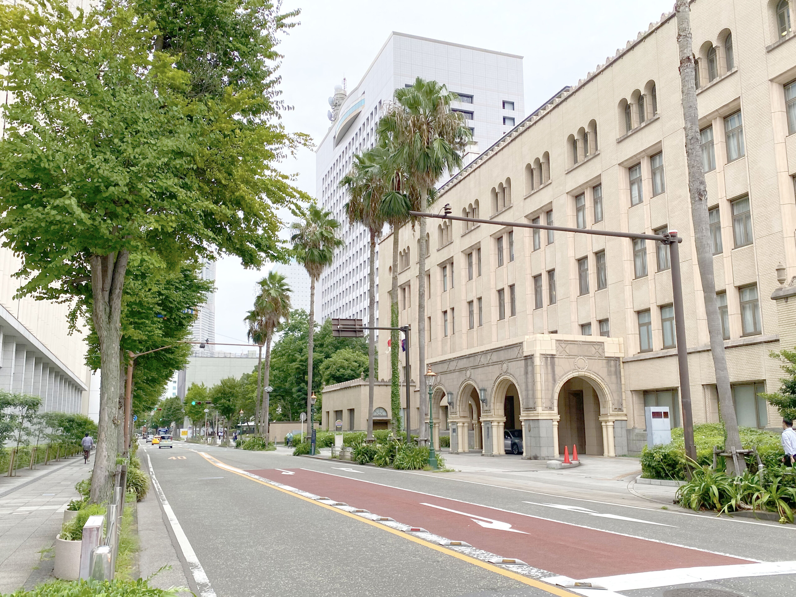 海岸通りは、象の鼻パーク前、およそ日本大通りと象の鼻が交差する一帯から始まって万国橋通りに突き当たるまで続く、上下二車線の直線道路です。