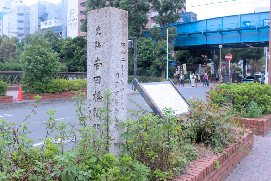 幕末(横浜開港後)に整備された、旧東海道と開港場をつなぐ道である”しんみち”こと横浜道はこの付近まで伸びていたとされていますが(現在の横浜駅西口方面と繋がれていました)、以降、この吉田橋関門を基準として、ここより港側が関内地区、その外が関外地区とされます。