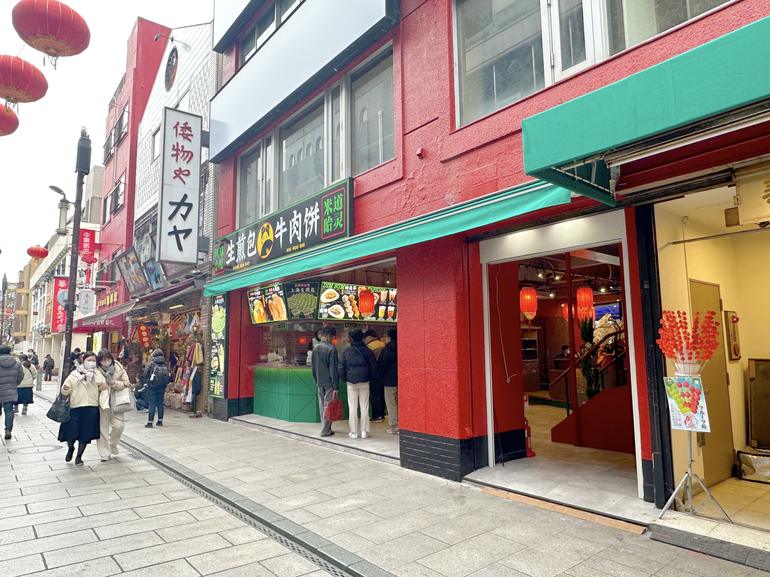 今は南門シルクロードにも随分食べ歩き店が増えたようですし、この付近にも王府井(公式サイト)や江戸清(中華街の”元祖・食べ歩き店”で、名物は豚まんです。公式サイト)、さらにはシウマイバー(公式サイト)があったりするので、元々”そういう一帯”だ(=道端での食べ歩きにはさほど違和感がない)という雰囲気はあったのですが、新たにその一角に新店が増えたという感じですね。