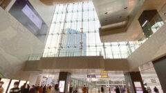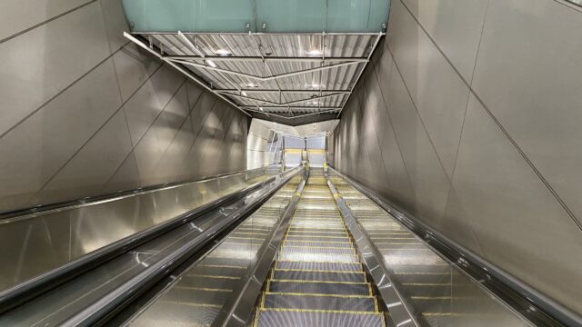 改札階へはエスカレーター(地下四階から地上階まで)エレベーター(地下三階から地上階まで)が用意されていますが、ホームの壁面と同コンセプトで整えられた壁面は、エスカレーター横にも続きます。