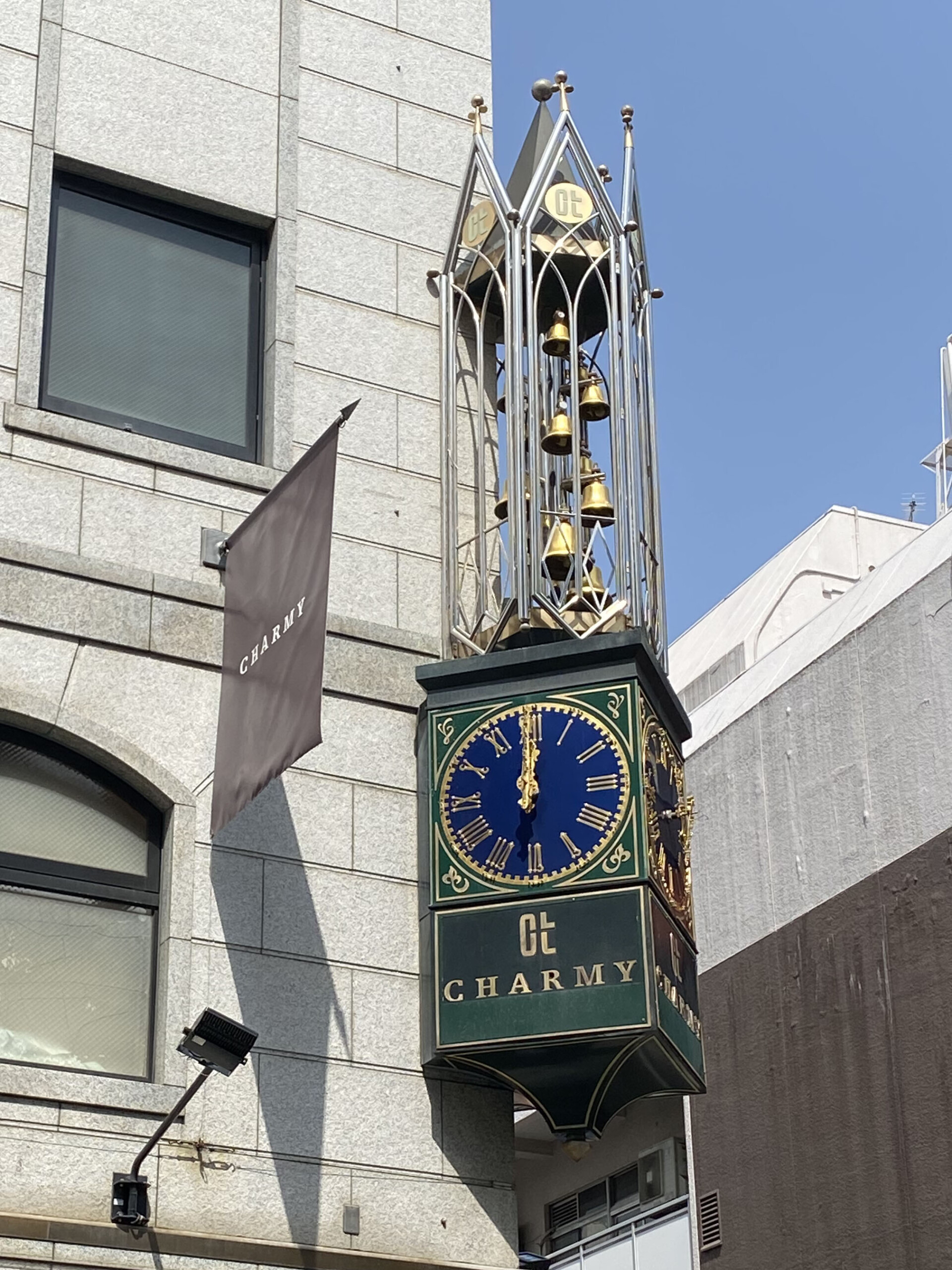 “CHARMY”(結婚指輪、婚約指輪のお店、元町本店です。公式サイト)では、お店の二階部分にカリヨン(=組み鐘)時計が設置されていて、毎日定時に鐘の音(赤い靴)を聴かせてくれます。