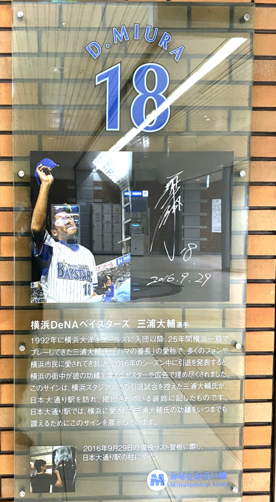 現役選手たちの雄姿に交じって、三浦大輔投手(21-25年一軍監督)が現役最終登板時に書いたサインも飾られていますが、