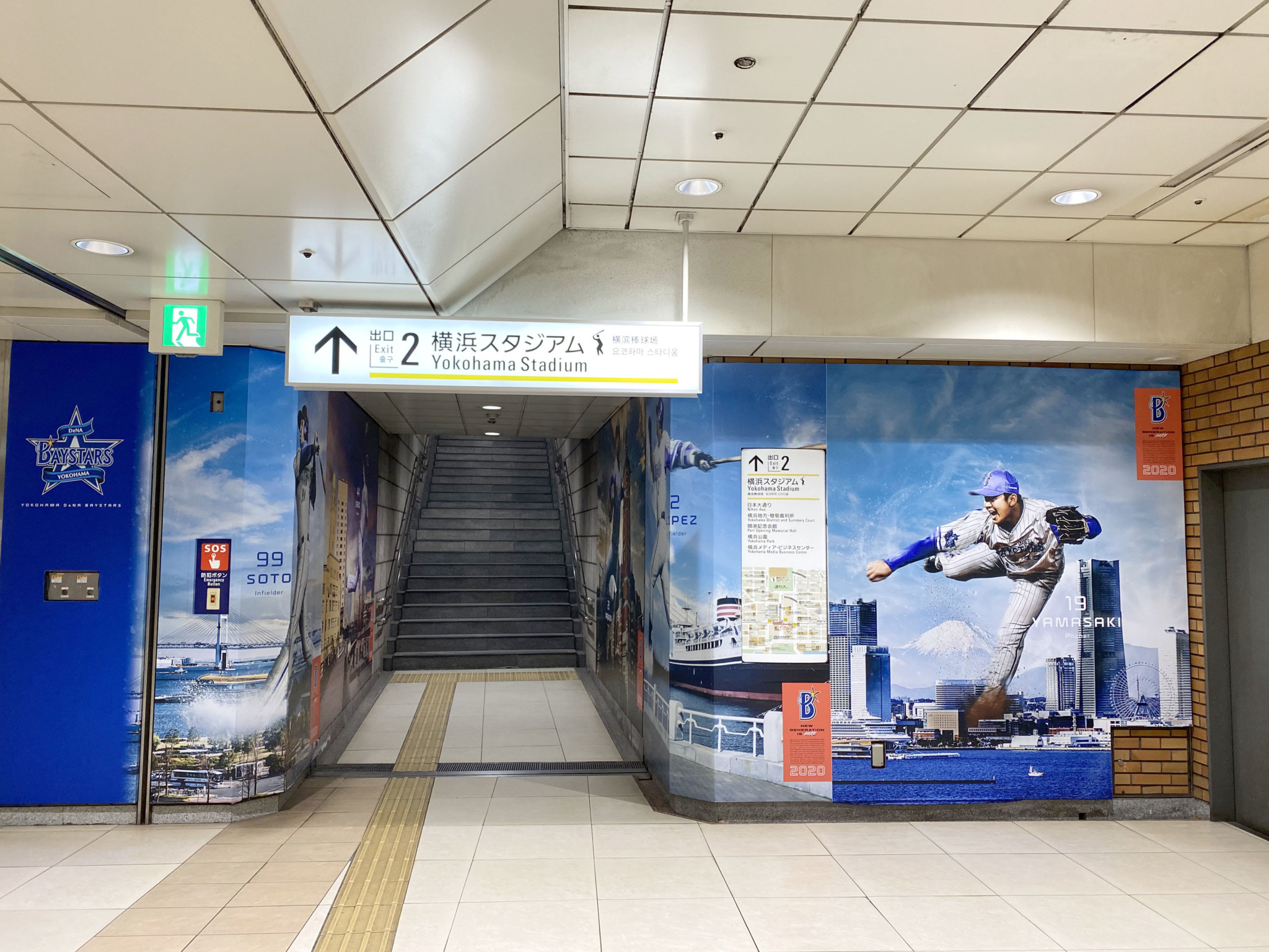 横浜DeNAベイスターズの本拠地・横浜スタジアムの最寄り駅でもあることから、現在、構内のそこかしこがベイスターズの主力選手等の写真で彩られています。