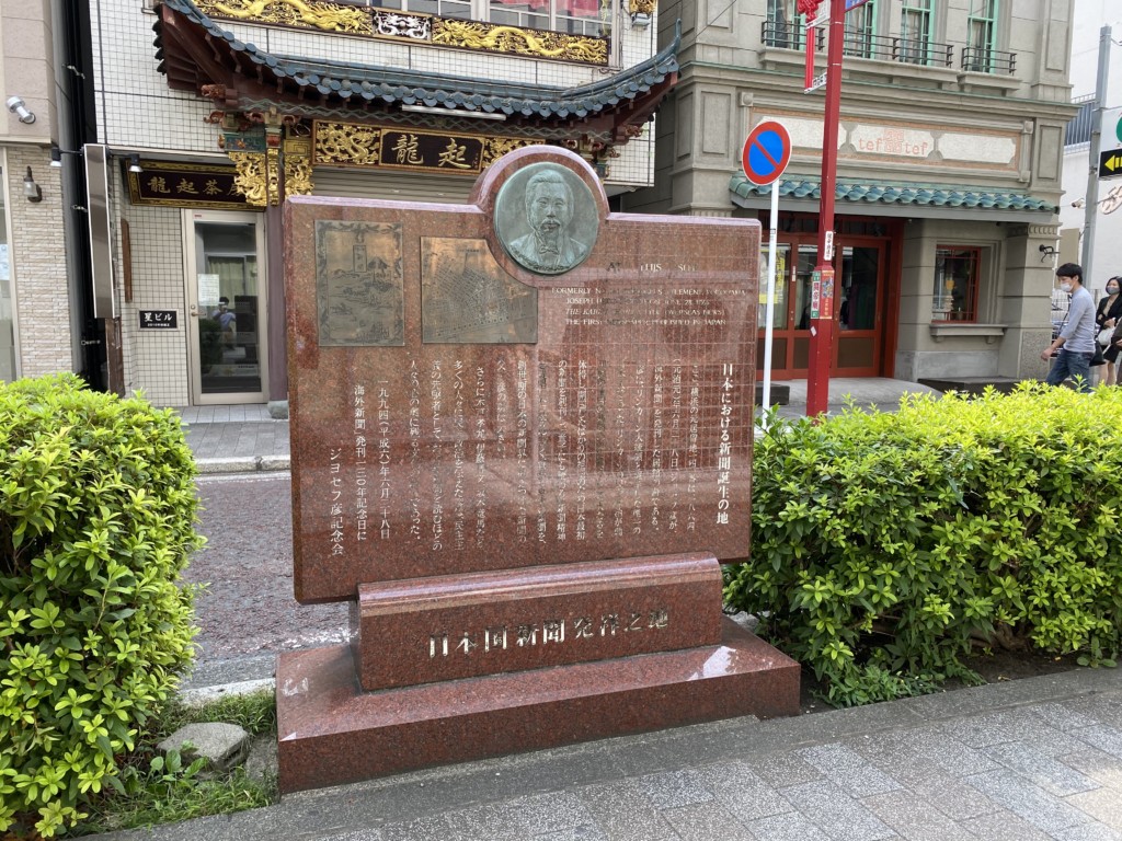 「日本国新聞発祥之地」記念碑は、英字新聞の邦訳新聞である「海外新聞」発行(1864年)を記念してのもので、編集者であったジョセフ彦(浜田彦蔵)の記念会によって1994年に設置されました。
