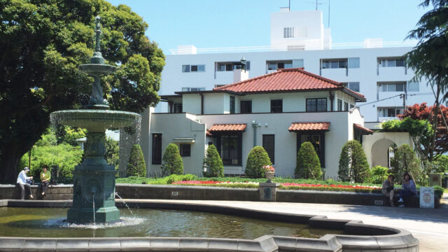 山下公園(横浜市公式サイト)中央口入ってすぐのところにある噴水=水の守護神像横手に、バラの花壇=未来のバラ園への道が用意されています。