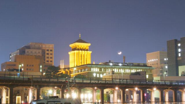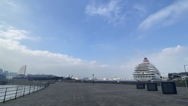 正面に見える特徴的なビルは、かつて客船ターミナルとして機能していた大桟橋ふ頭ビルで、