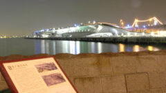 “夜景さんぽ”でJR根岸線・桜木町駅方面から汽車道経由で歩いた時、新港橋を渡ってすぐのところにある入り口から象の鼻パークに入ると、ほどなくライトアップされた大さん橋とベイブリッジが視界に入ります。